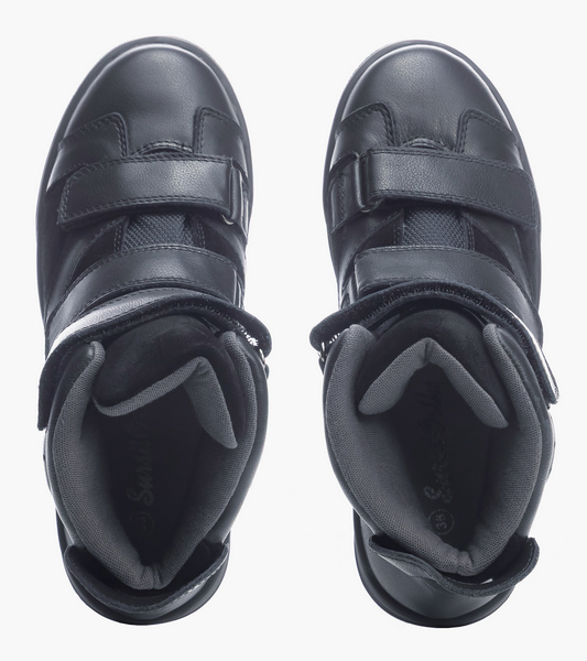 Актуальная модель в стиле Jordan  ̶̶̶  идеальный вариант на весну и осень. Модные полуботинки на кедовой подошве обеспечивают максимальный комфорт в повседневной носке. В модели есть формоустойчивый задник, который фиксирует пятку, убирает излишнюю подвижность и предотвращает заваливание стопы внутрь. Вкладная ортопедическая стелька комфортно поддерживает своды стопы. Верх модели выполнен из натуральной кожи. Удобные липучки Велкро позволяют быстро надеть и снять обувь. Для защиты от натираний полуботинки имеют мягкий кант в районе голени. Текстильная подкладка позволяет коже дышать, предотвращая потливость. Подошва выполнена из гибкой прочной резины, которая активно гасит ударную нагрузку на суставы.